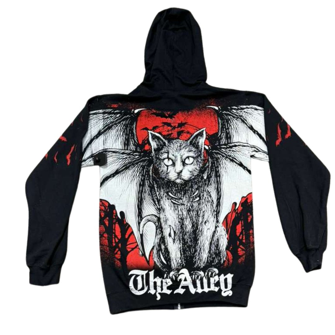 Monster Print Black Cat Hoodie: Printed in all-over style; with the classic black cat on the front in alley with a skyline, and new gothic cat design on the back. Limited edition item.