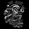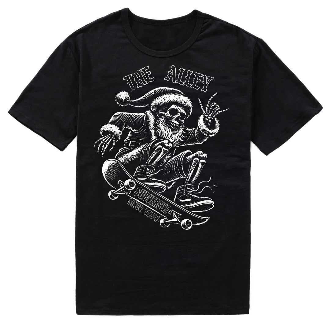 Skater Santa Tshirt: Skip the chimney - Santa is heading down the half pipe! Printed in white on solid black 100% cotton men's cut tshirt.